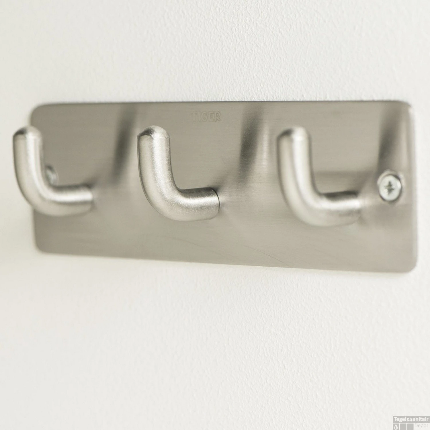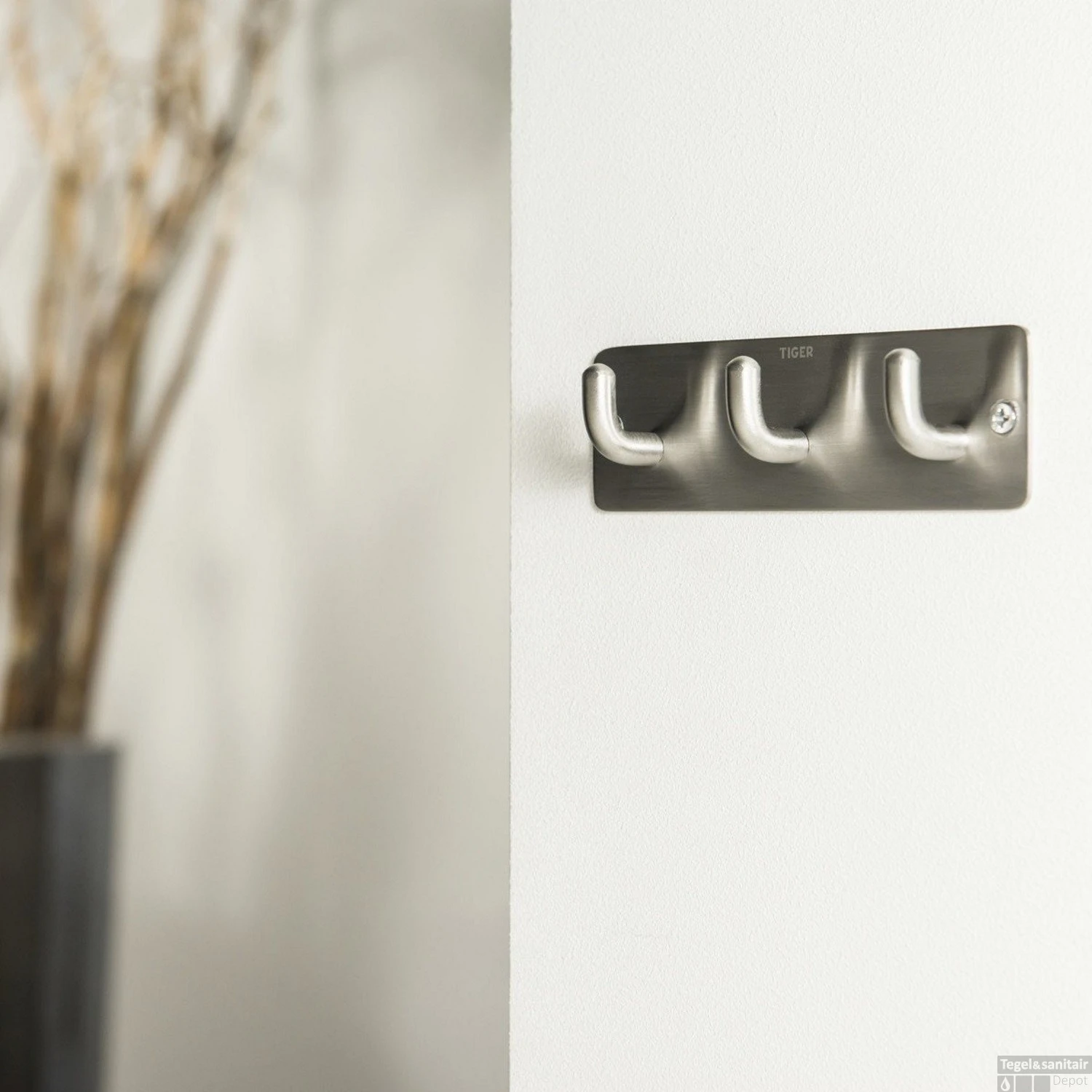 Deze stijlvolle haak van het merk Tiger is gemaakt van geborsteld roestvrij staal, het materiaal is licht mat zilver van kleur. De 3-delige haak is eenvoudig te bevestigen met de bijgeleverde schroeven. De haak kan worden gebruikt voor het ophangen van bijvoorbeeld uw handdoek en/of badjas en heeft een moderne uitstraling. De producten van het merk Tiger zijn allen voorzien van 5 jaar fabrieksgarantie.