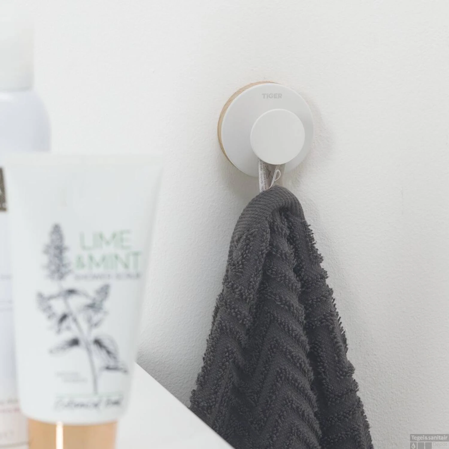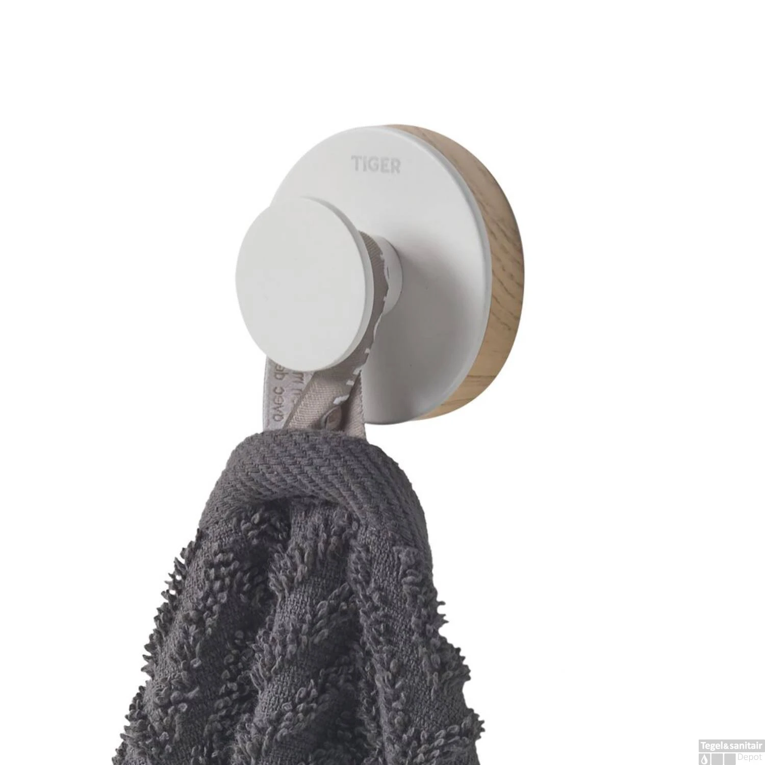 “De haak groot uit de Urban serie van Tiger is uitgevoerd in de kleur mat wit en wordt geleverd met twee decorringen. De decorringen, in de kleur licht eiken en grijs, maken het mogelijk een subtiel kleuraccent toe te voegen.